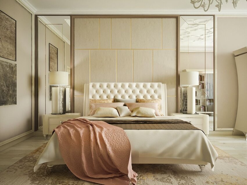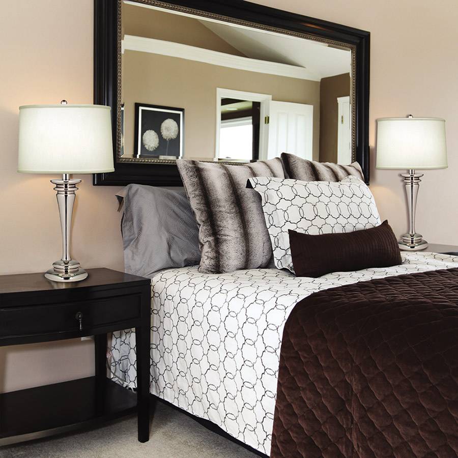 Задекорировать стену над кроватью можно зеркалами. Например, большие зеркальные полотна по обе стороны от изголовья визуально увеличат пространство, придадут спальне более уютный вид.