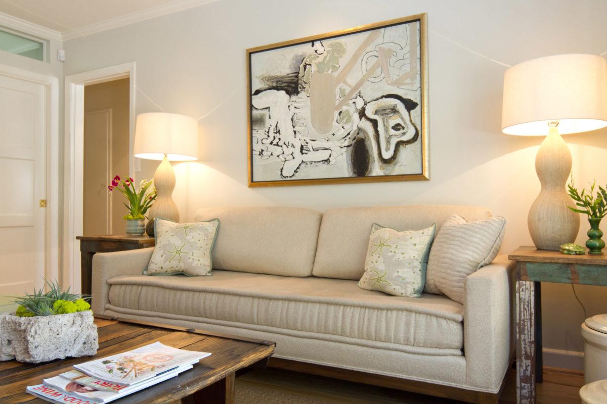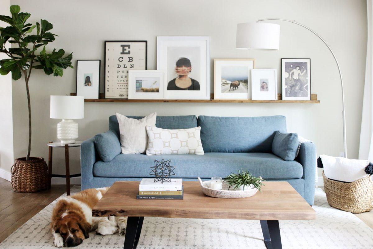 Между диваном и картиной обязательно оставляют промежуток примерно 15−20 см.