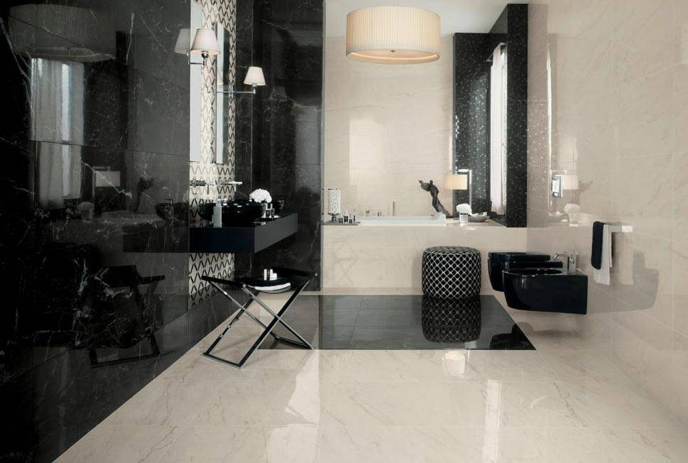 Один из распространенных вариантов, который вполне может реализовать свой потенциал даже в скромной по размерам ванной комнате – полированный керамогранит. Он очень здорово отражает свет и насыщает пространство комнаты великолепной игрой бликов. Это позволит вам грамотно расставить все оформительские акценты. Несколько примеров фото, где керамогранит прекрасно справляется с задачей создания несколько сурового и тяжелого, но все же очень современного и законченного стиля.