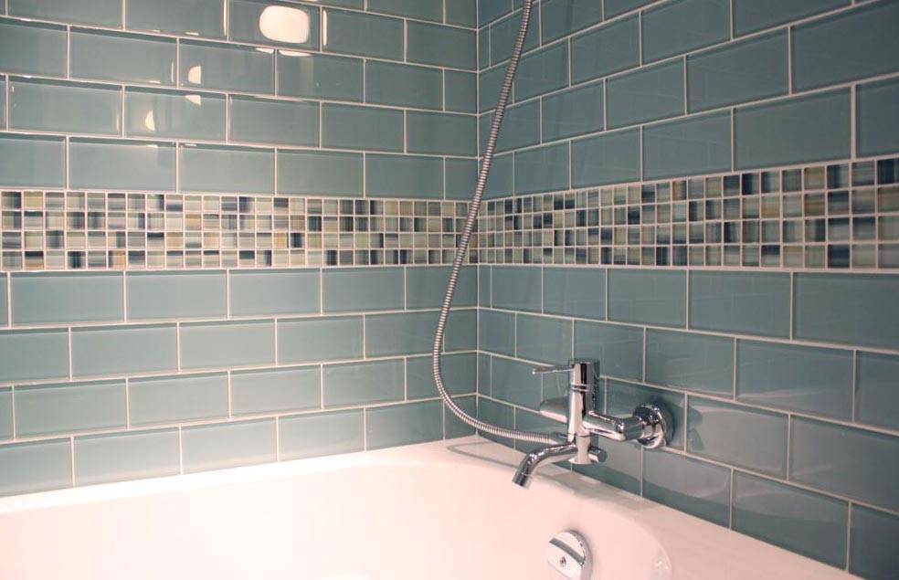 Стеклянная плитка хороша тем, что с ней можно сделать декор с подсветкой. Также материал применяют для укладки на пустых участках стены.