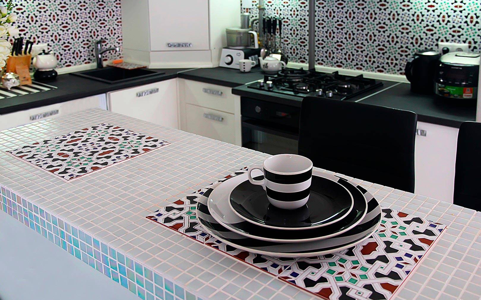 - Возможность создания уникальных, дизайнерских столешниц путем комбинации различных плиточных элементов.