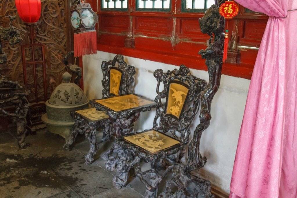 Стол с двумя стульями, вазы с цветами, картины, причудливой формы древесина. Парк Дагуань, Пекин