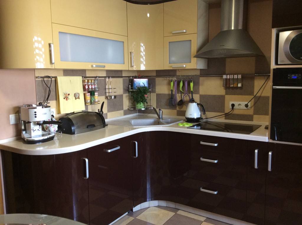 Обычно глянцевые гарнитуры изготавливают в двух цветах. Нижний ярус более темный, а навесные конструкции светлее.