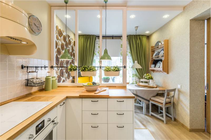 Приглушенный зеленый цвет обоев, белый кухонный гарнитур, деревянный пол и столешницы – дизайн интерьера классической кухни. Использование строгих форм и сочетаний – правило стиля
