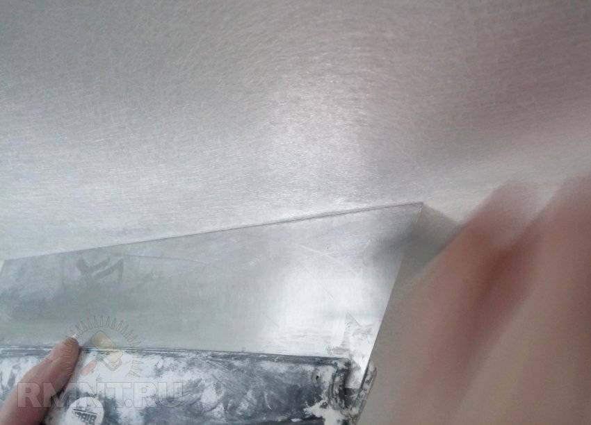 - Лист прикладывают к потолку и приглаживают пластиковым обойным шпателем от центра к краям, выгоняя воздух.