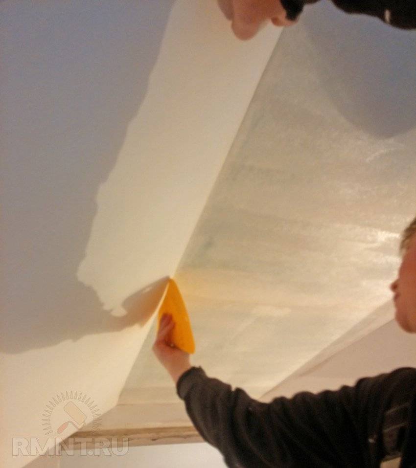 - Сцепление происходит за 5–10 минут. В течение этого времени можно отрегулировать положение обоев на потолке.