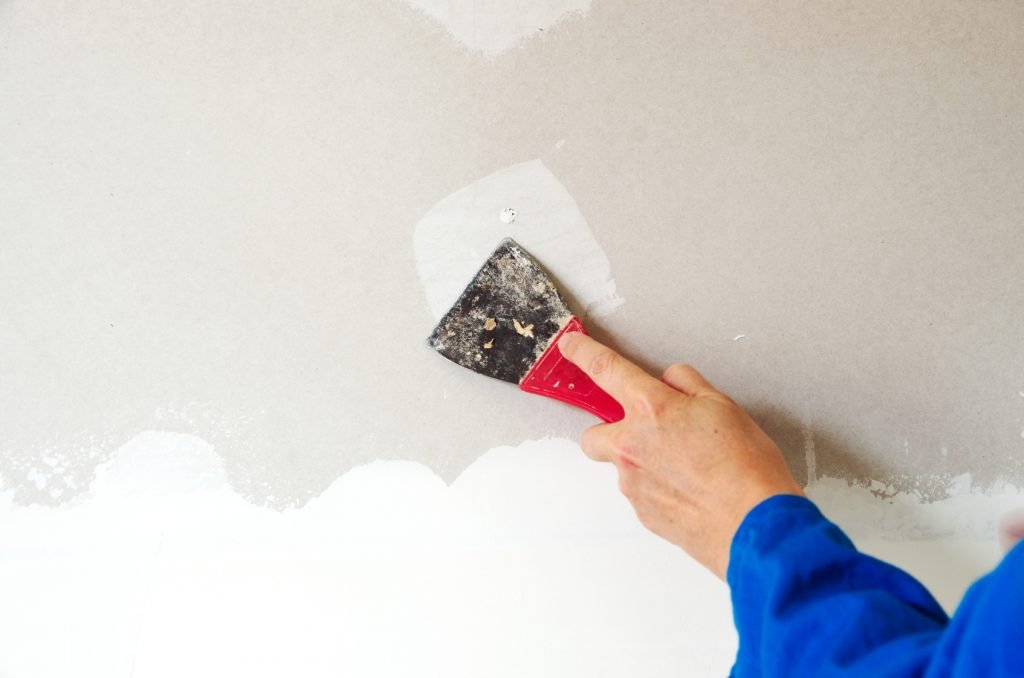В процессе очистки на потолочной поверхности станут видны выбоины, которые следует загрунтовать и зашпаклевать. Но лучшее решение — зашпатлевать всю плоскость потолка.