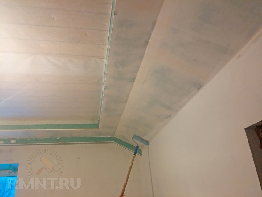- по всей потолочной площади нанести слой клея, который в данном случае будет выполнять функцию грунтовки – он не допустит впитывания следующего связующего слоя;