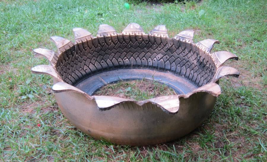 Отступив от края 10-14 см, делаем надпилы и удаляем среднюю часть, а в прорезанной части дополнительно делаем углубление. Внутрь насыпаем камней (для дренажа, порядка 10 см), сверху – слой почвы и высаживаем цветы.
