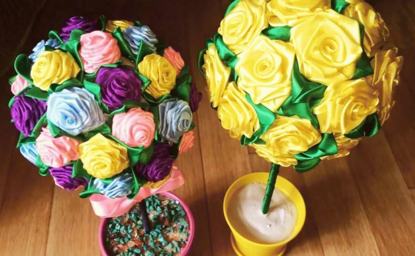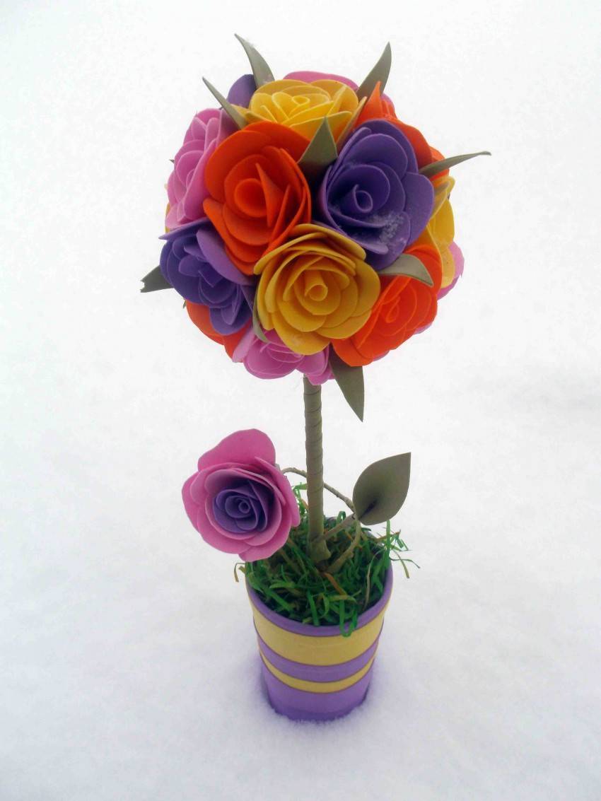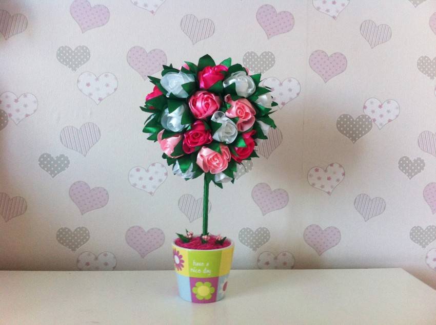 Подарок подруге. Ко дню рождения близкой приятельнице можно создать нежный топиарий из роз. Для изготовления цветов берите ленточки, салфетки, ткань или гофрированную бумагу. Подойдут и искусственные цветочки небольших размеров.