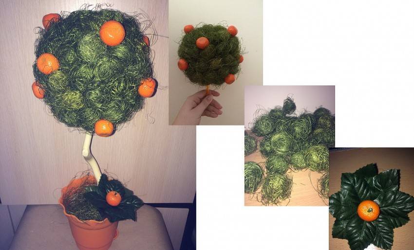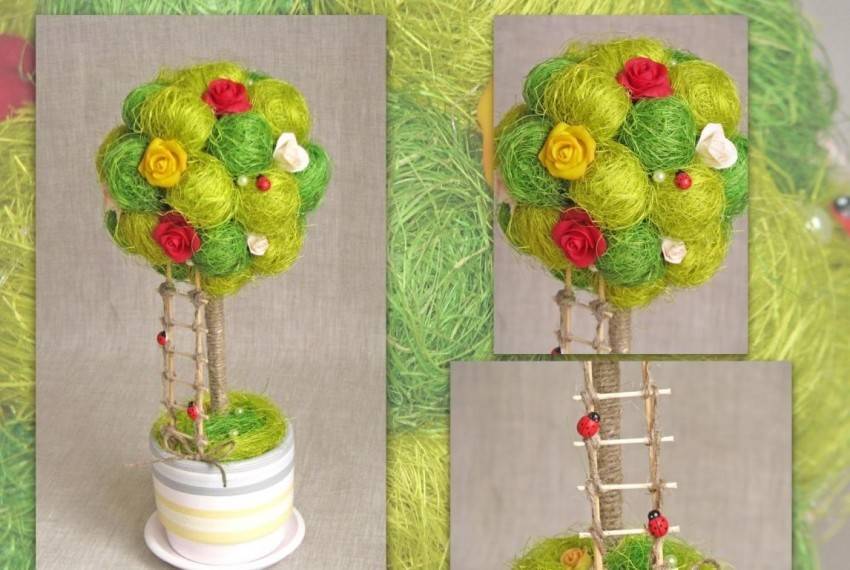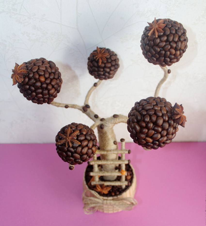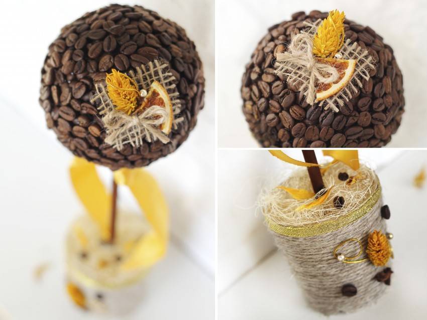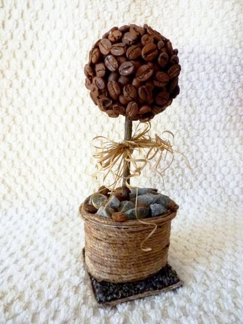 Крона делается из пенопластового шара, обмотанного нитками и обклеенного кофейными зернами. Ствол деревца делается из трубы, слегка изогнутой, его декорируют грубой натуральной ниткой.