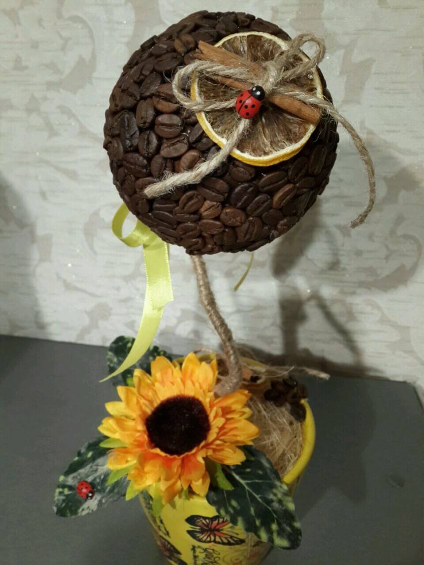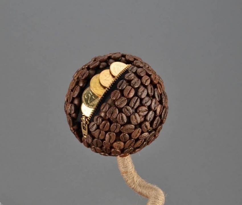 Топиарий, сделанный из кофейных зерен и украшенный монетами, станет наилучшим подарком коллеге