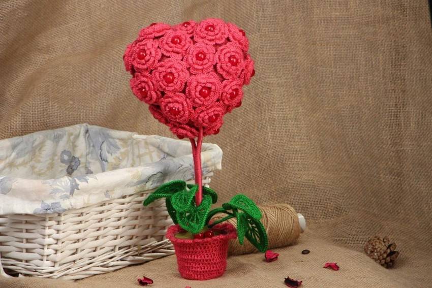 Крону в виде сердечка изготавливают из картона. Ствол обматывают толстым слоем бечевки. Кружку заполняют жидким гипсом и вставляют в него готовое деревце. Получается белый стеклянный горшок-подставка. Кружку дополнительно украшают кофейными зернами и косичками из сплетенной бечевки, поверхность гипса засыпают белыми камешками.