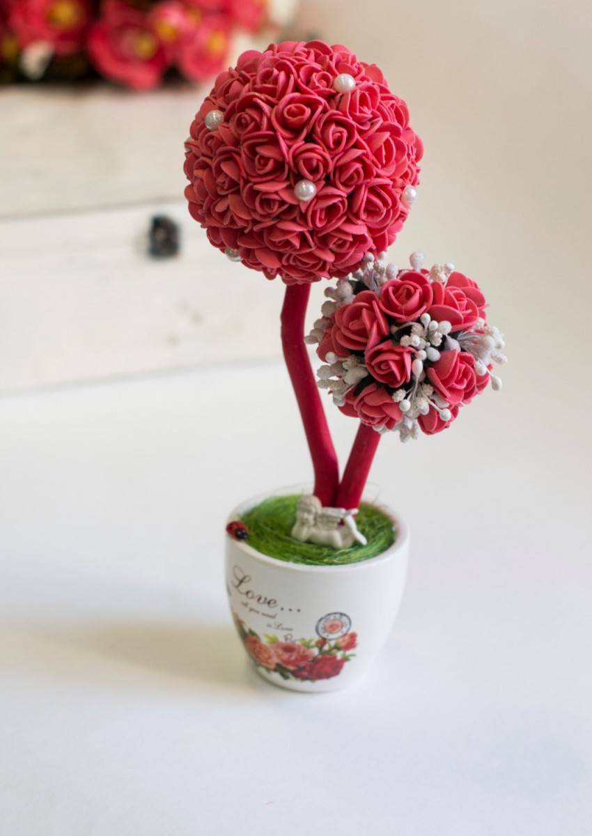 Топиарий из искусственных цветов может стать постоянным украшением обеденного стола, шкафа-витрины, журнального столика, каминной полки. При чем в большинстве случаев лучше делать сразу два одинаковых деревца, чтобы создать ощущение симметрии в интерьере. А еще топиарий из искусственных цветов – отличная идея для подарка или украшения свадьбы.