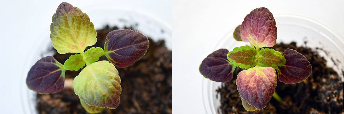 Растения провели у меня 8 месяцев — с августа по апрель. Если не считать пикировки сеянцев, пересаживала я их лишь однажды — из стаканчика 100 мл в емкость объемом 200 мл. Никаких удобрений не вносила и использовала первый попавшийся в магазине универсальный торфогрунт. Поливать, что характерно для колеусов, требовалось раз в 1–2 дня — они любят воду. Подсветку в виде обычной настольной лампы использовала в вечернее время, когда солнце уже садилось, — и то не каждый день.