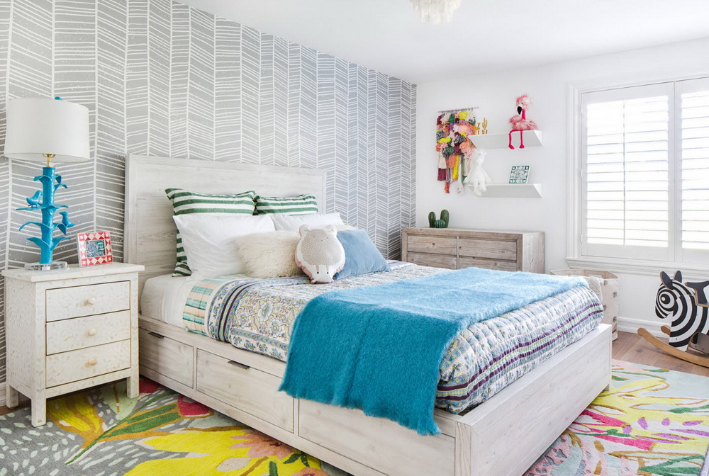 Сочетание покрытия разных оттенков позволяет отделить пространство для работы, отдыха или сна. Для этого используют темные цвета или броские рисунки.