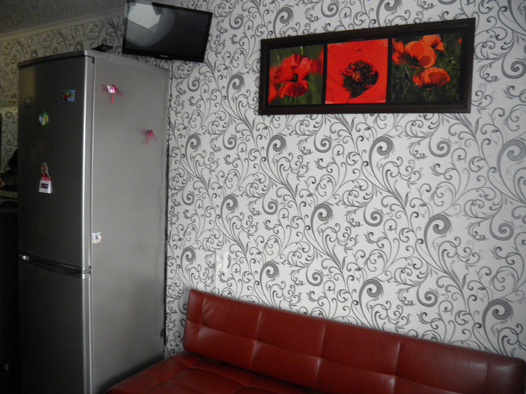 В кухнях пеналах очень интересно выглядит цветовой акцент на одну стену, которая оклеивается обоями контрастного цвета или с рисунком. Вообще выделение цветом одной из стен сразу же делает интерьер смелых и запоминающимся. Но такой шаг и ко многому обязывает. Выделение одной стены без поддержки цветом в другой части комнаты сделает интерьер негармоничным. Поэтому, выбирая цвет обоев, надо поддержать его в мебели или текстиле.