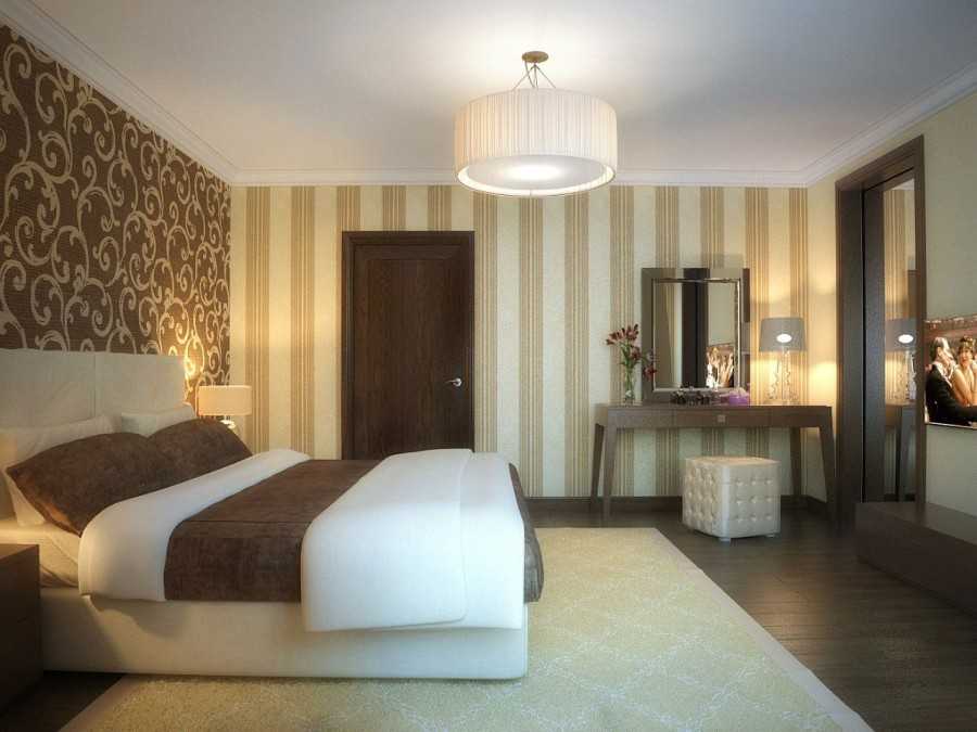 При наличии комнаты с большим метражом не используйте нежные и светлые оттенки. Используйте однотонный темный, насыщенный дизайн обоев или нейтральные тона с объемным орнаментом.