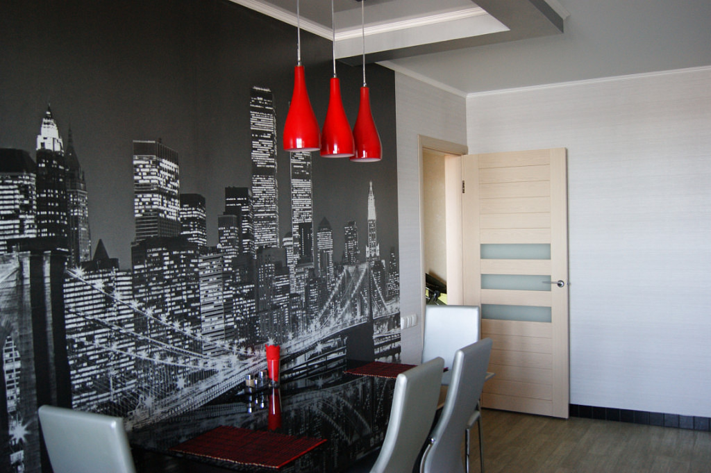 Не стоит клеить их сразу на все стены. Сделайте небольшой красочный акцент — так вы добьетесь оригинального внешнего вида и избежите эффекта перегруженности. Лучше всего размещать такие обои над обеденным столом или напротив него.