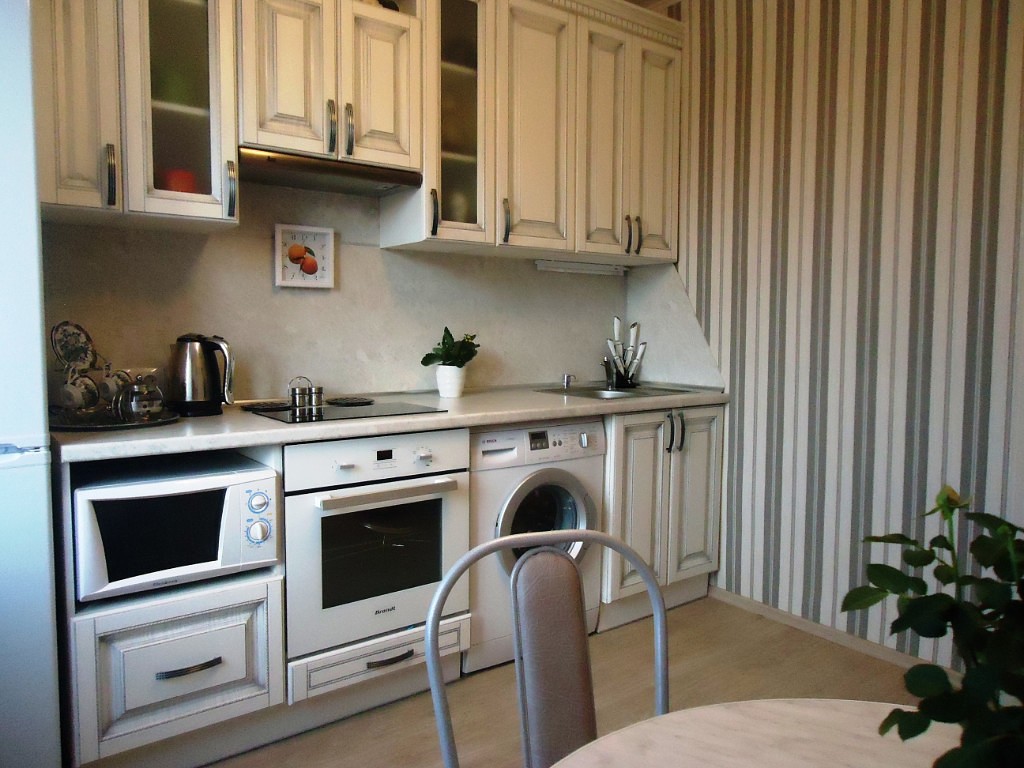 - Комбинация обоев должна гармонично вписываться в общий стиль кухни. Следует избегать конфликтов в тонах гарнитура и стен.