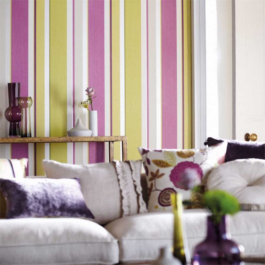 Первый варианты подразумевает использование широких полос обоев с обеих сторон от центра. Лучше выбирать яркие и контрастные оттенки. Второй вариант подразумевает оклейку на одну стену посередине широкой полосы, а на противоположную сторону можно разместить яркие обои разной ширины.