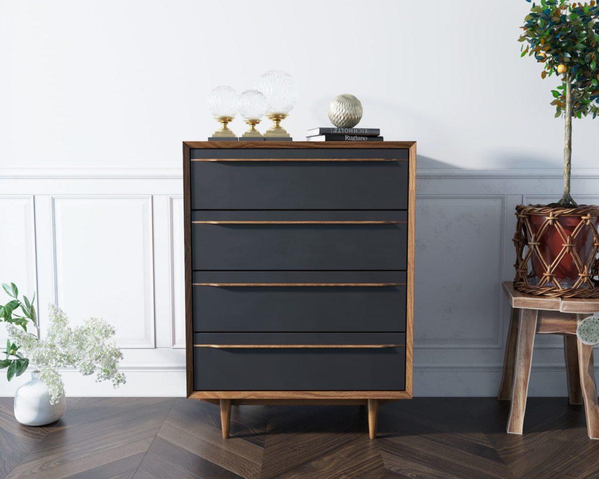 - Стандартное количество ящиков в комоде – от двух до пяти и более, при этом они могут быть разной высоты. Наиболее частое значение – 4-5, именно такое число обеспечит удобный доступ к вещам. Вместо увеличения количества «вверх» дизайнеры часто используют деление пространства «вдоль», размещая на одном уровне как минимум два-три ящика.