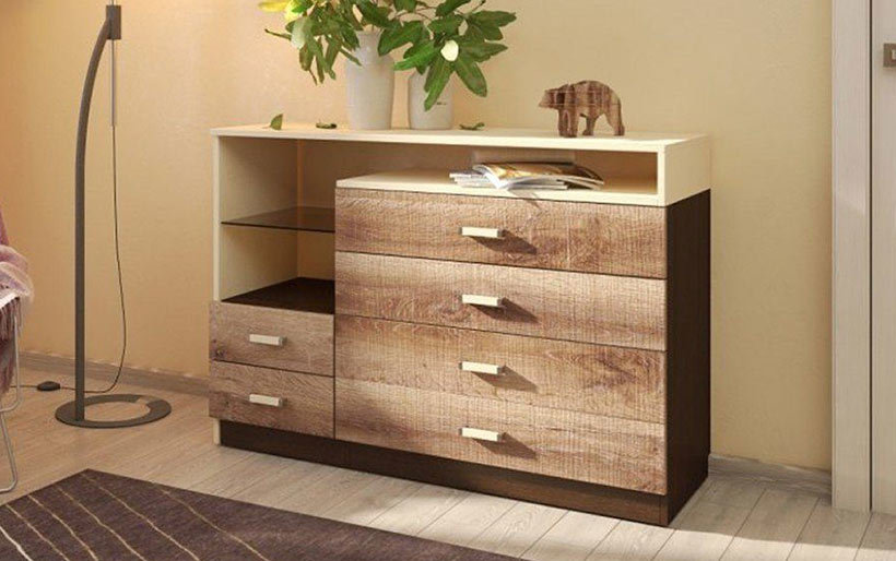ДСП. Такой материал является легкодоступным и недорогим, поэтому из него активно изготавливаются различные предметы мебели, в том числе комоды. Однако недостатком ДСП считается его низкое качество. Мебель из этого материала не является прочной и устойчивой к износу, поэтому ее эксплуатационный срок редко превышает отметку в 5 лет.