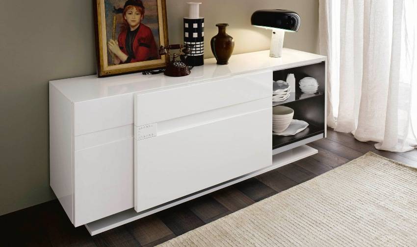 Современная модель комода с белыми глянцевыми фасадами в интерьере гостиной