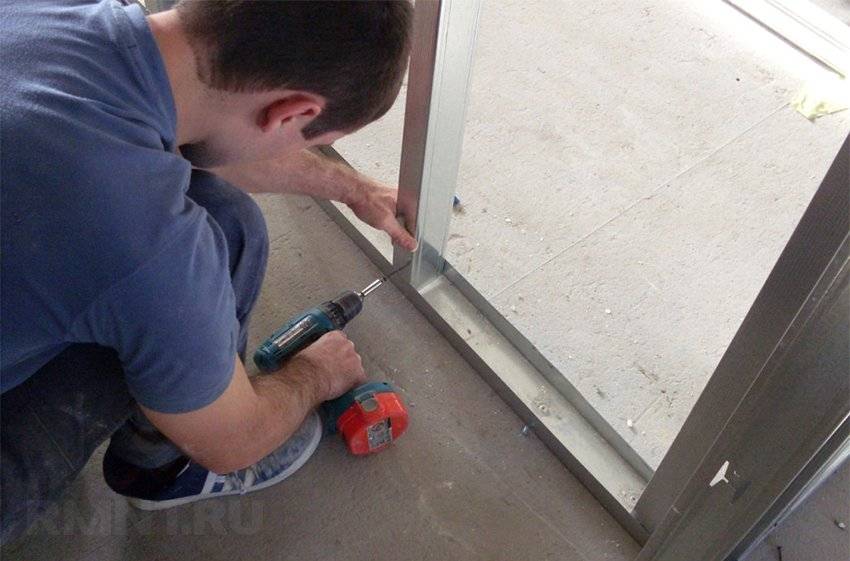 6. По обе стороны дверной коробки устанавливаются опорные стоечные профили. Их изготавливают из стоечных профилей методом насадки, заправляют в направляющие и крепят к полу и потолку;