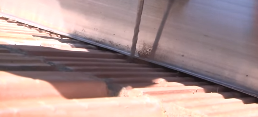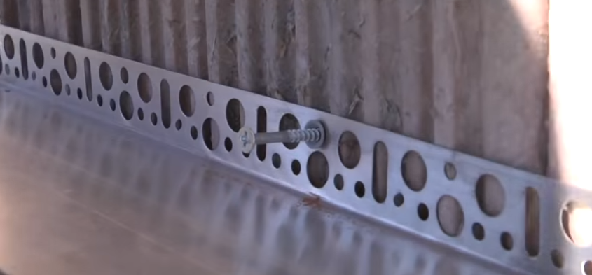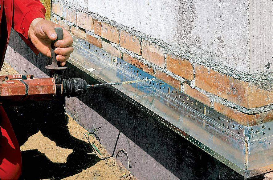 Шаг 5. Прикладывают к стене цокольный профиль и в тех местах, где это необходимо, после чего подбирают компенсатор такой толщины, чтобы она соответствовала ширине зазора между фасадом и алюминиевой планкой.