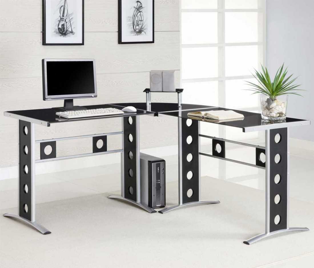 - Неплохой вариант — угловой стол. Он идеально впишется в любую комнату, и благодаря такому решению, на него поместится больше техники.