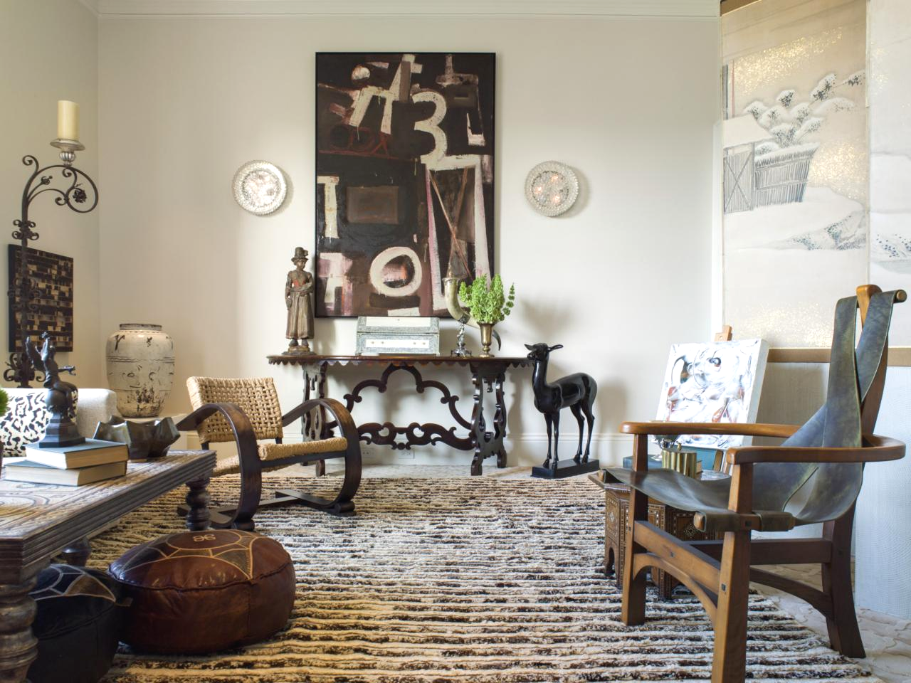 Например, рядом со столиком можно поставить простые пуфики и получить яркий центр посреди комнаты.