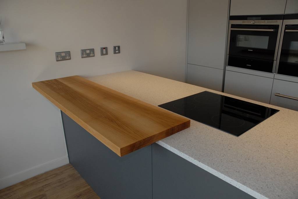 Оформление кухонного пространства не должно ограничиваться традиционными материалами. Очень оригинально и стильно выглядит столешница, выполненная из закалённого стекла. На полу и стенах можно использовать керамическую плитку, но очень крупных форматов и гладкой фактуры.