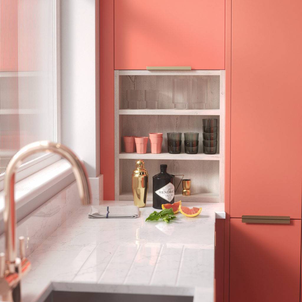 Веселая, оптимистичная кухня может стать не просто комнатой для приготовления пищи. Коралловый цвет, напоминающий спелый, аппетитный персик, — это цвет, созданный для интерьеров, связанных с блюдами, фруктами, овощами и ароматом специй.