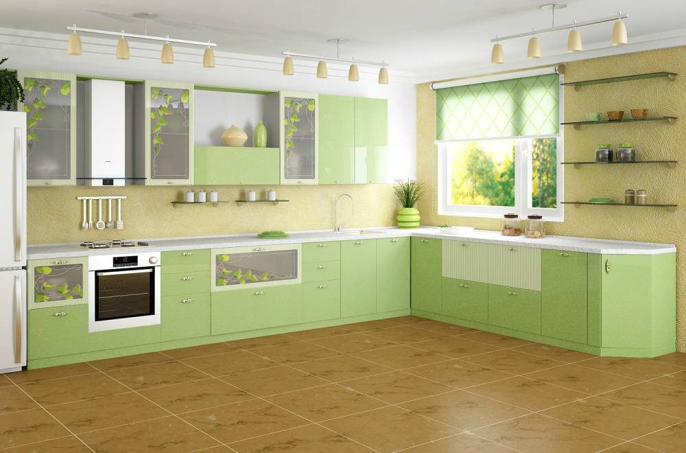 Салатовый цвет в дизайне кухни — удачный выбор, если есть желание освежить интерьер. Однако с этим оттенком лучше не перебарщивать.
