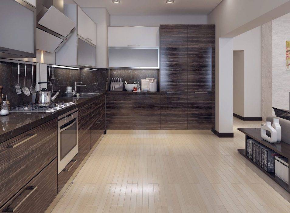 В отделке только пола – он может быть облицован не только деревом, паркетной доской или ламинатом, но и плиткой из керамики или керамогранита, а также природным камнем. Однако не стоит выбирать материал слишком темных тонов, так как на темно-коричневом фоне все капли воды, крошки, пыль и другие бытовые загрязнения станут вдвойне заметны.