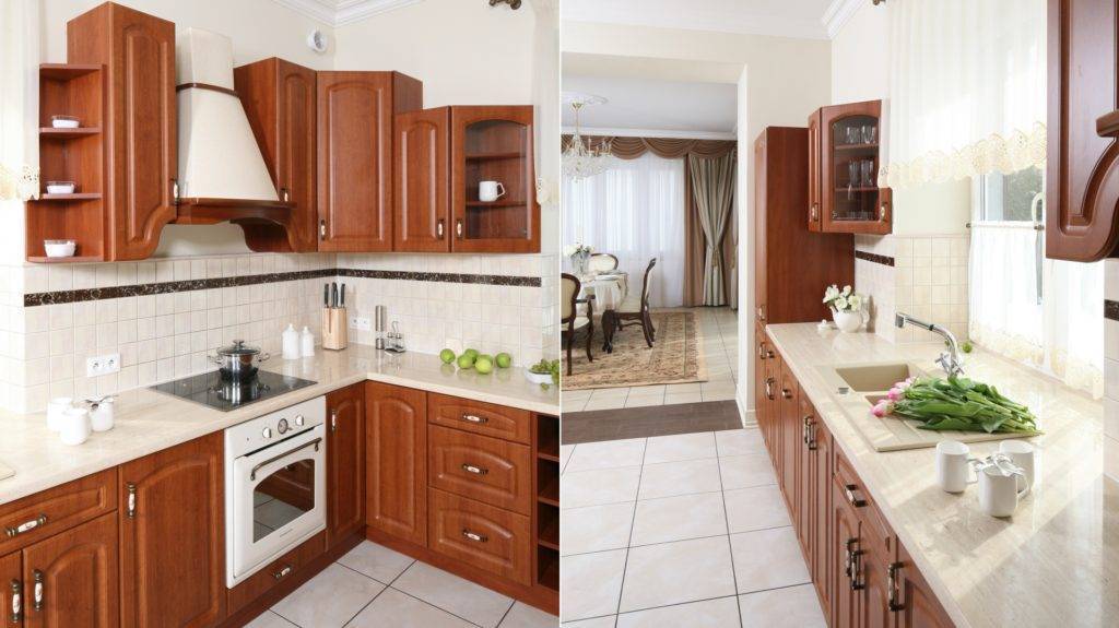 Также гарнитуры из МДФ или ДСП могут сочетать в себе сразу несколько цветов и, например, иметь вставки коричневого или более светлого цвета, тиснение, резьбу и т. д. Нередко такие фасады имеют и вставки из стекла с золотыми орнаментами. Смотрится такая мебель в кухне богато и дорого.