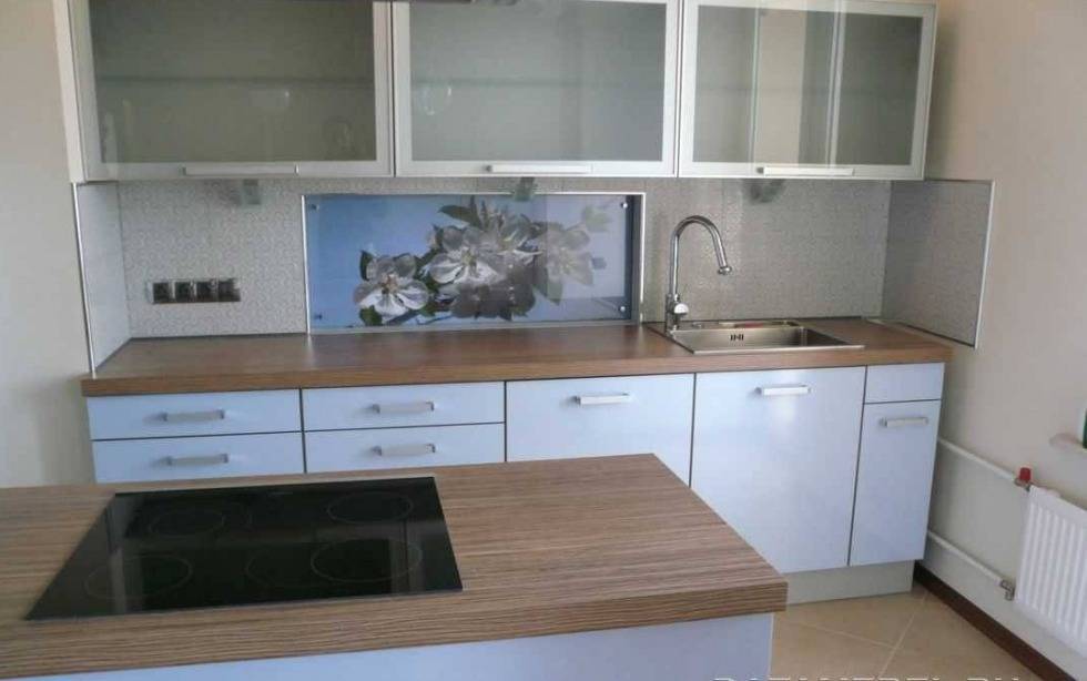 Фартук можно сделать под цвет общего фона, используя керамическую плитку или закаленное стекло — это позволит сделать помещение более светлым и просторным.