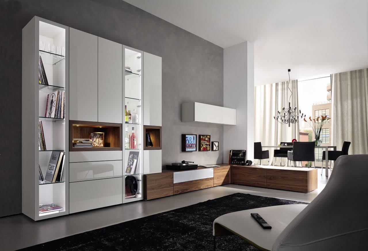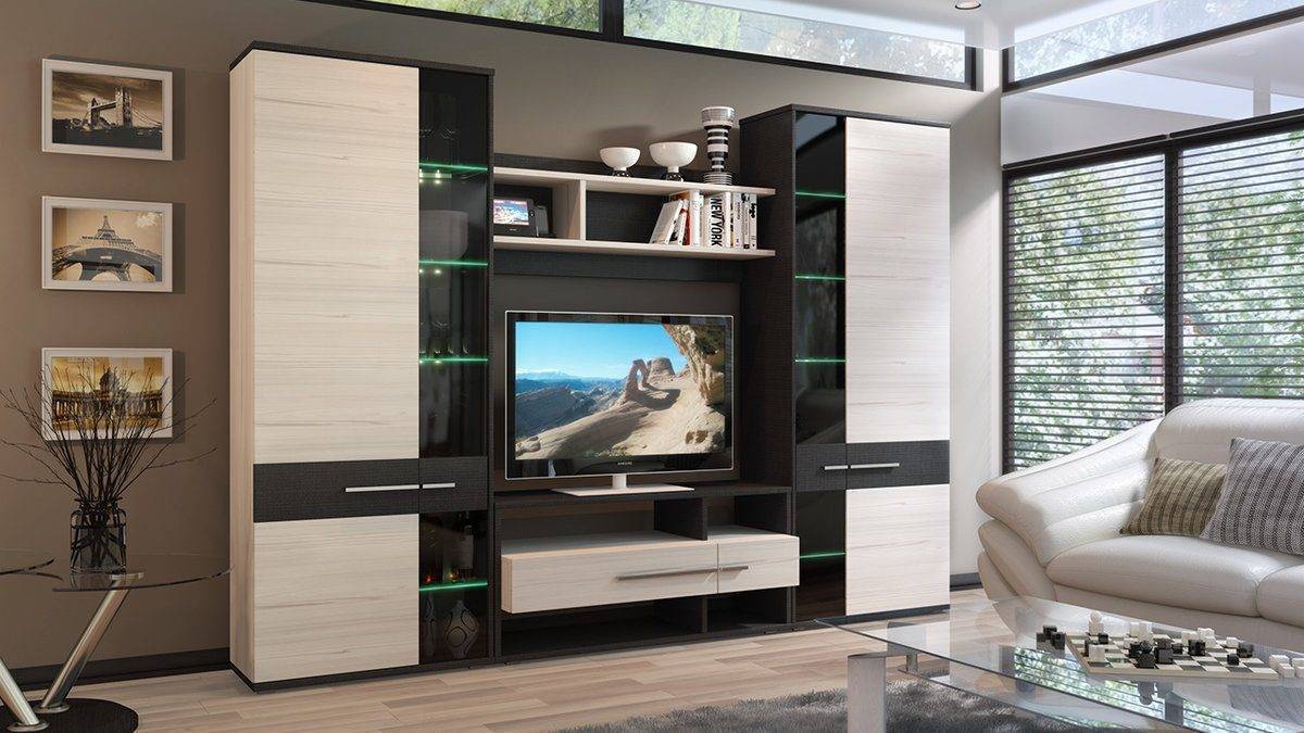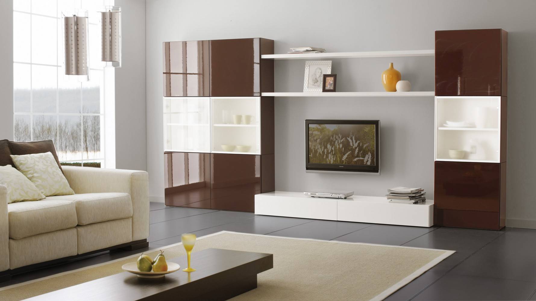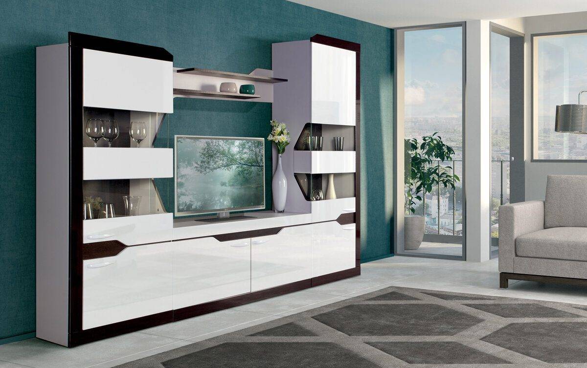 Бело-шоколадная стенка в гостиной с глянцевым фасадом
