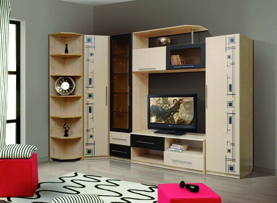 По размерам эти конструкции должны иметь полное соответствие гостиной комнате: для малого помещения необходимо выбирать особые компактные наборы, содержащие минимум элементов. Ведь крупные предметы даже небольшую комнату сделают более маленькой, а в просторном помещении можно запросто гармонично сочетать крупные по размеру тумбы и шкафы.