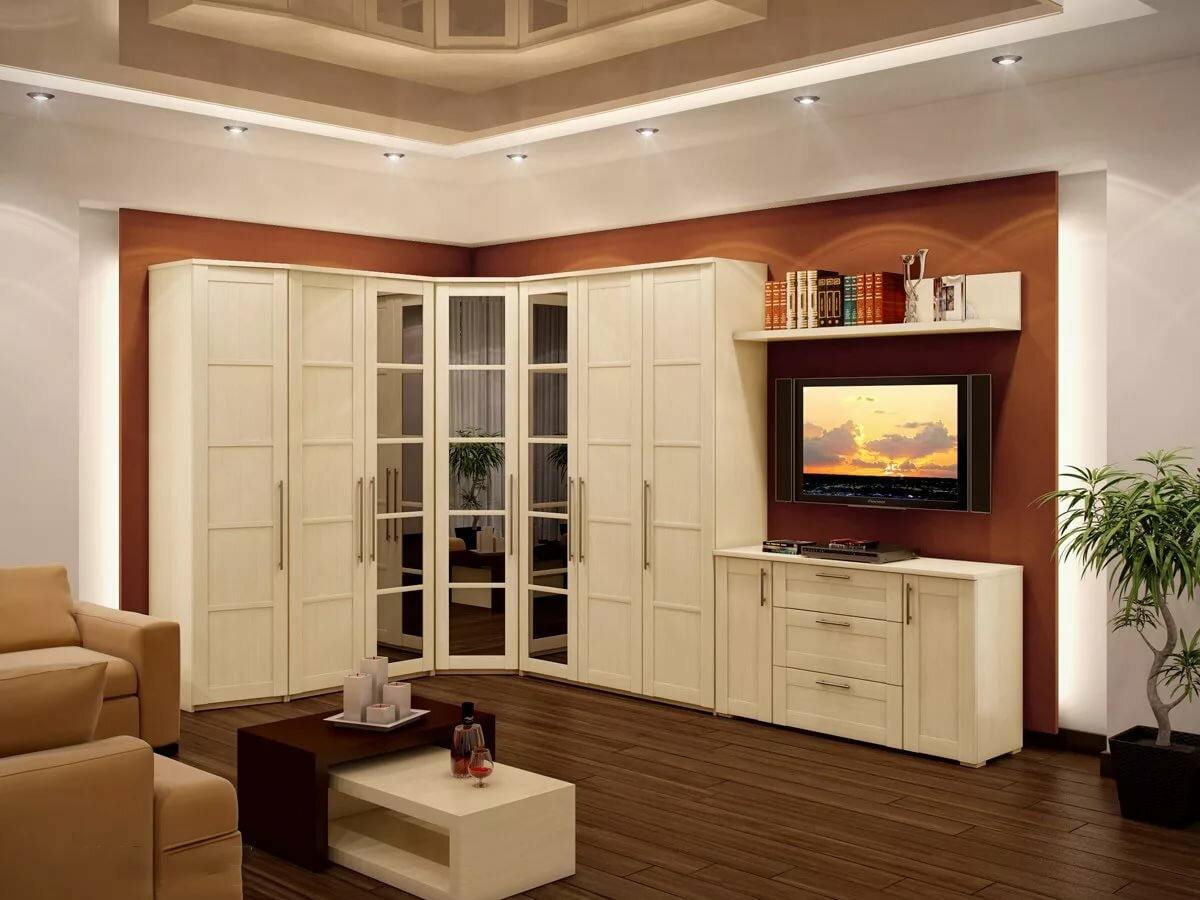 Гостиная в значительной степени используется для отдыха и релаксации. Хотя в такой комнате основной является диван, журнальный столик, тумба под телевизор или комод, размер квартиры обычно заставляет вводить более вместительную конструкцию, например, угловой шкаф. Такой гардероб станет дополнительным местом для одежды, постельных принадлежностей или более крупных бытовых приборов, таких как пылесос.