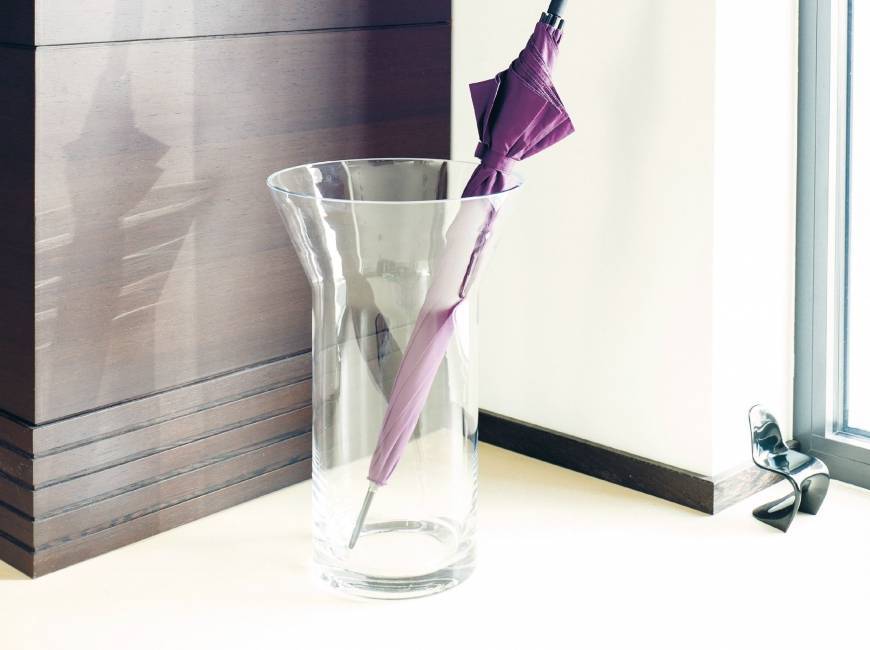 Необычным вариантом зонтницы будет стеклянная ваза четкой геометричной формы. Не стоит бояться, что такая подставка будет хрупкой. Эти предметы интерьера изготавливаются из сверхпрочного стекла. Они просты в уходе и долговечны.