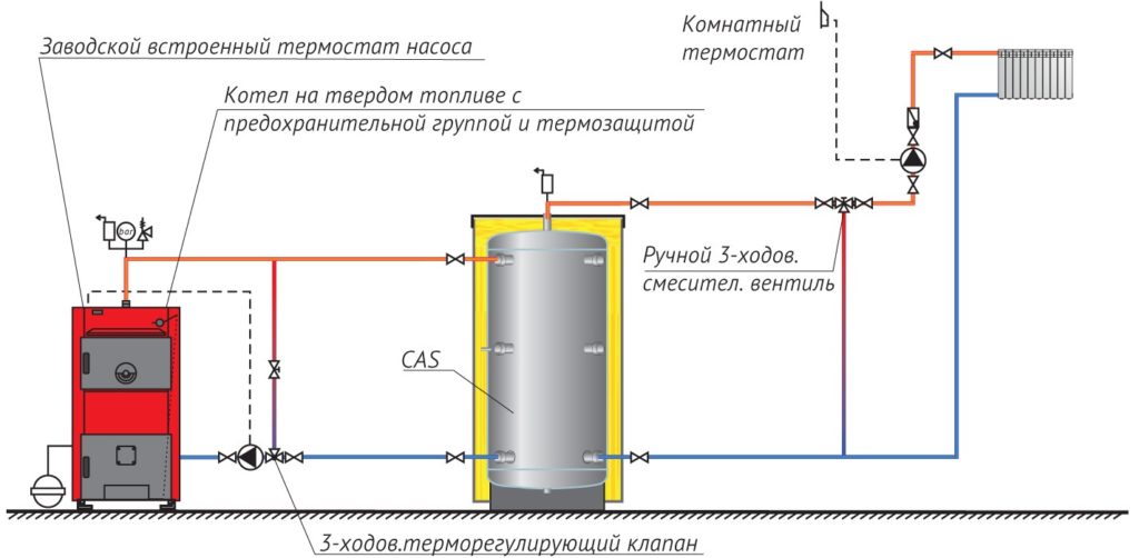 - комплектная группа безопасности, трехходовой смесительный клапан, циркуляционный насос в структуре обвязки обогревательного устройства;