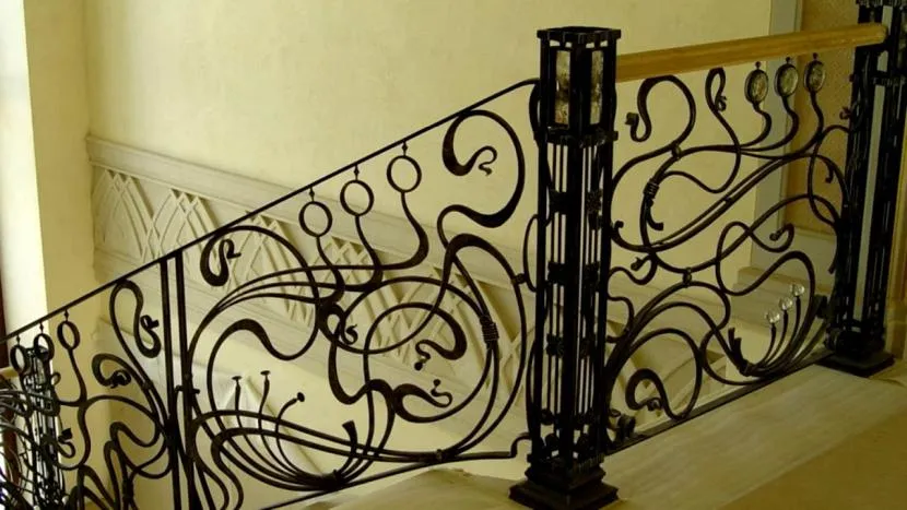 В кованой лестнице в стиле модерн присутствуют прихотливые изгибы симметричных элементов. Стилизованный растительный орнамент может включать и плоские, и объёмные детали.