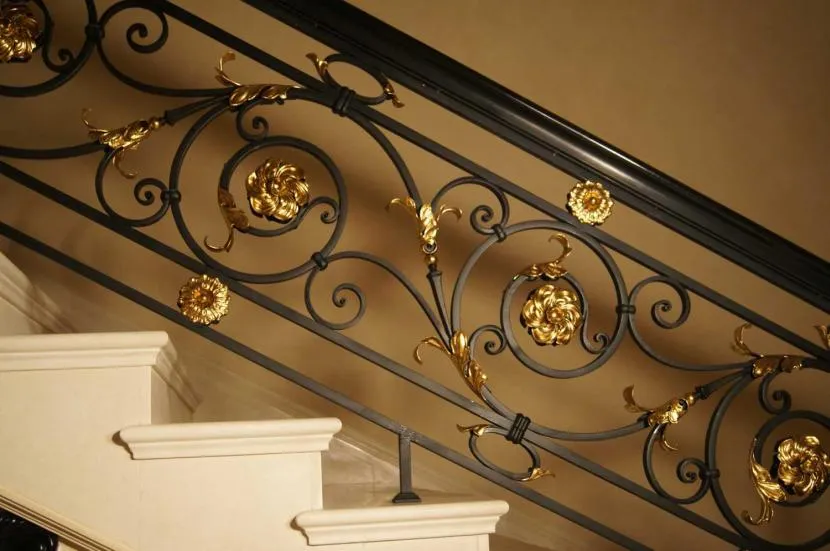 Кованые перила с позолотой Источник stroikairemont.com Качество кованой ограды зависит от таланта и профессионализма мастера, о чем можно судить по его портфолио выполненных работ. На окончательный вид лестницы влияет и выбранный металл. Художественная ковка для лестницы в доме выполняется из следующих металлов: