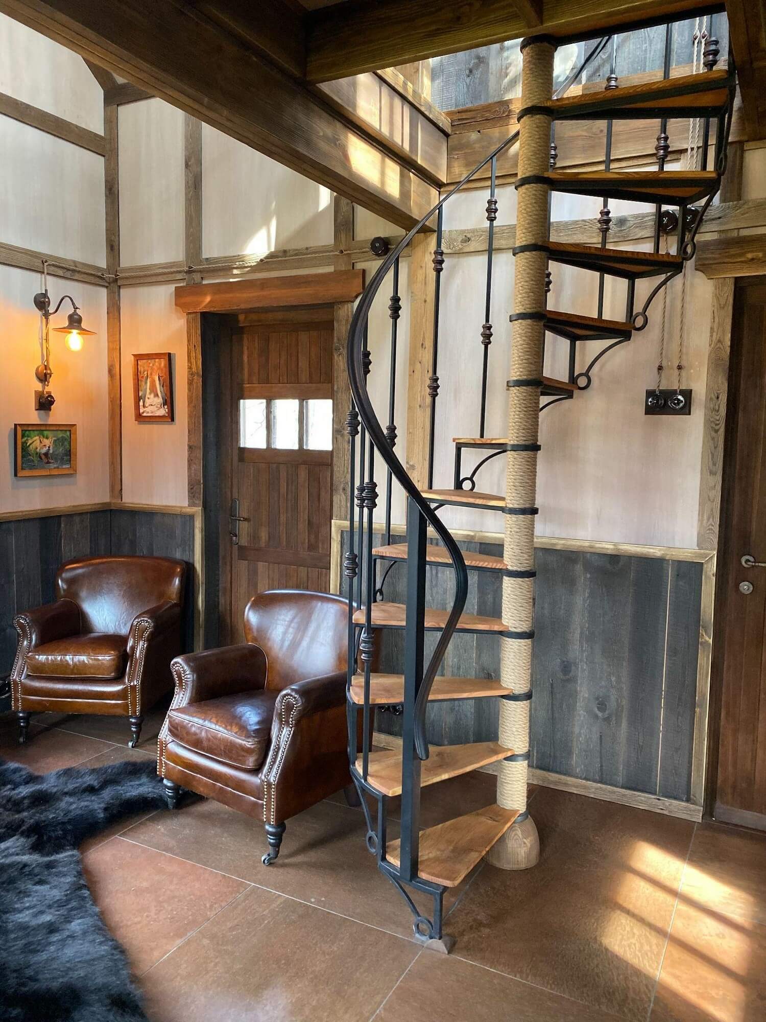 Порой приходится сталкиваться с очень необычными проектами. Так, один клиент кузницы заказал лестницу для домика на дереве! Это был дом в стиле «шале», отделанный деревом, украшенный шкурой медведя. Лестница была винтовая, и её центральный столб закручивался шнуром.