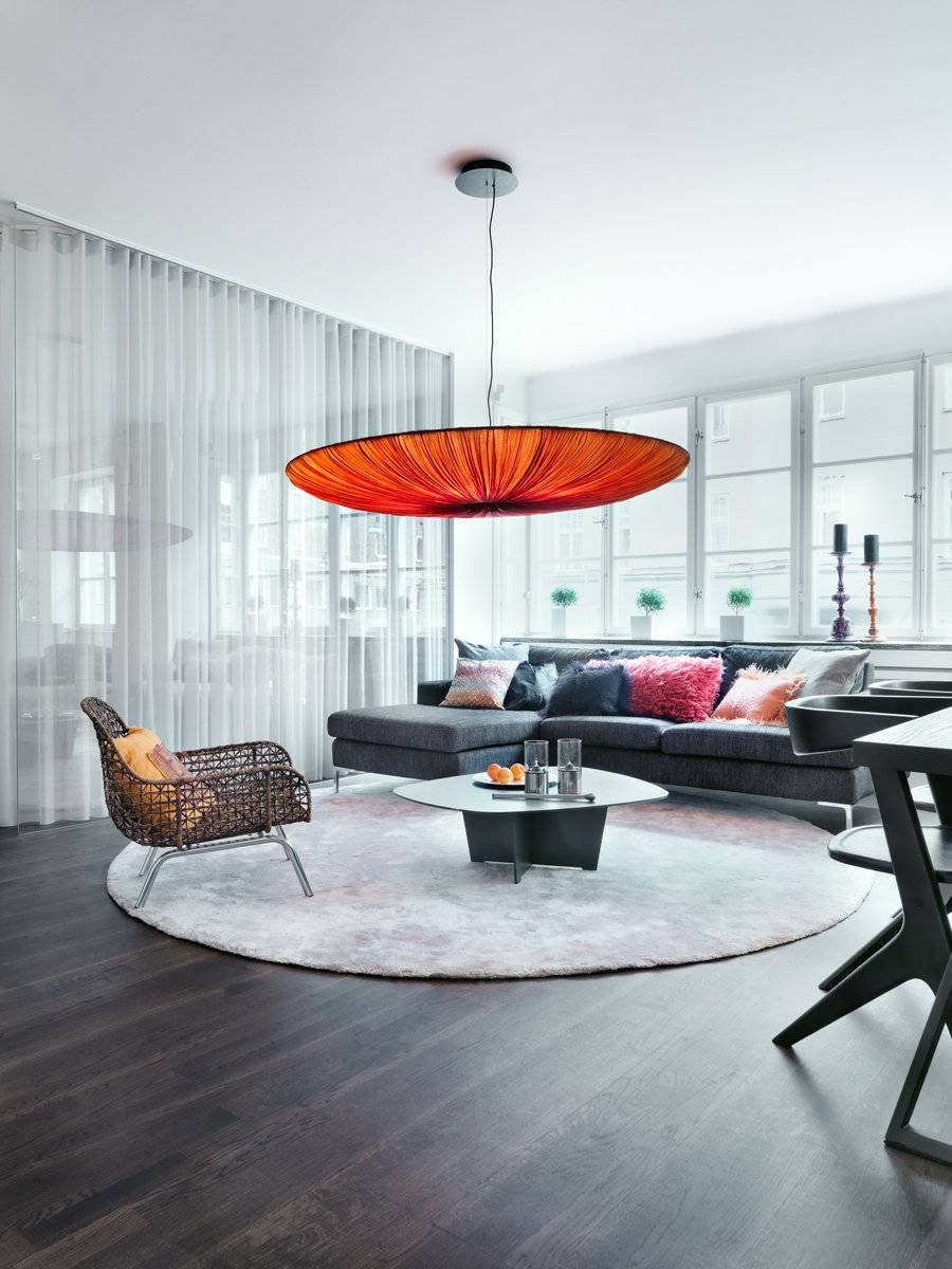 Важно лишь поставить мебель так, чтобы ноги стояли именно на мягком покрытии. Симметрично с деталью такой формы используют большие круглые люстры, зеркала на стенах