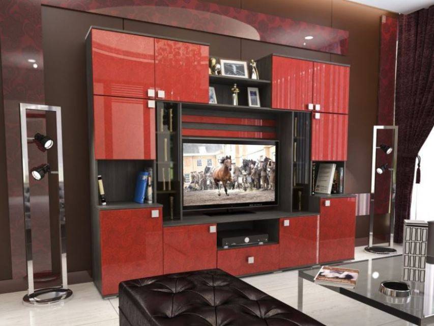 - Стенки с открытыми полками. На протяжении последнего десятилетия люди часто ставили в гостиной типовые стенки с широкими открытыми полками, местом под телевизор. В настоящее время это уже не модно. Лучше отдать предпочтение классической мебели или шкафам, выполненным в стиле минимализм.