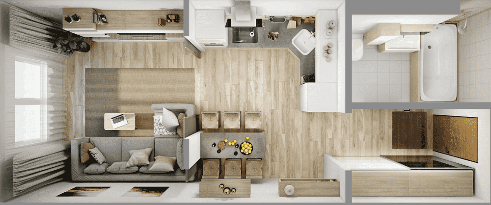 - В квартирах с небольшой площадью (до 35м2) стоит комбинировать некоторые объекты. К примеру, подоконник может служить барной стойкой. Он займёт совсем мало места, зато будет фантастически выглядеть и функционально работать.