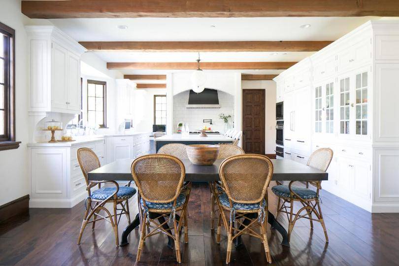 На фото обеденная группа в центре кухни с диваном в эркере.